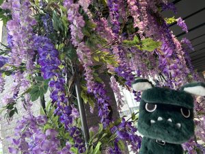すりーだいやのショールームでは藤の花のディスプレイとデリ丸たちが