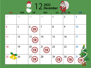さて、12月の定休日は毎週火曜と第三水曜日に加えて