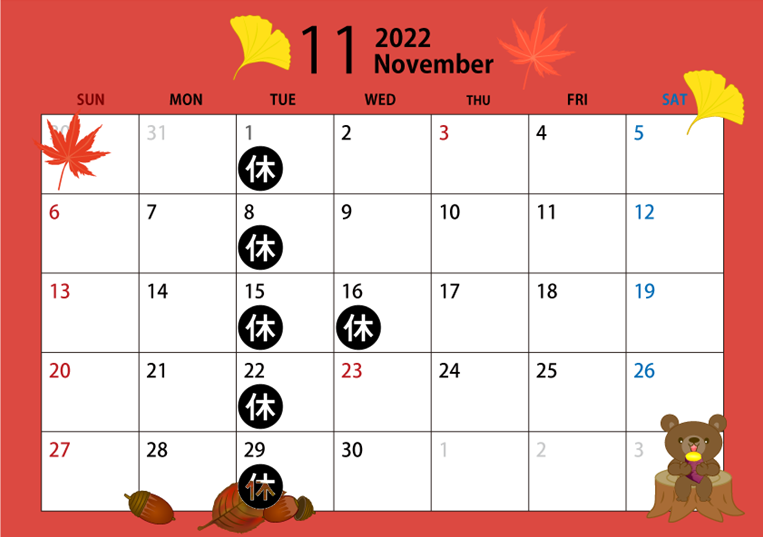 11月は、1日(火)、8日(火)、15日(火)、16日(水)、