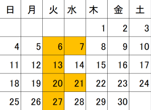 下記の通り、毎週火曜日と第1・第3水曜日が定休日です。