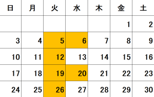 下記の通り、毎週火曜日第1・3水曜日が定休日です。