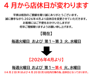 🌸店休日の変更・4月店休日のお知らせ🌸 ■ 2026.02.26