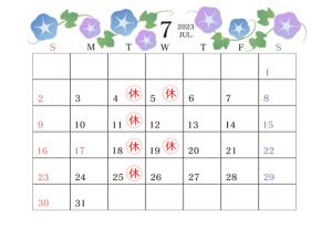 7月の定休日は毎週火曜日と第1・3水曜日がお休みとなります。