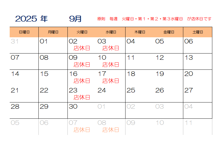 9月の店休日のお知らせです🌻