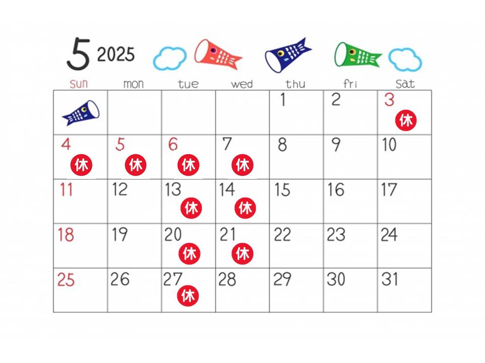 5月は毎週火曜日、第1・2・3水曜日の定休日と合わせて