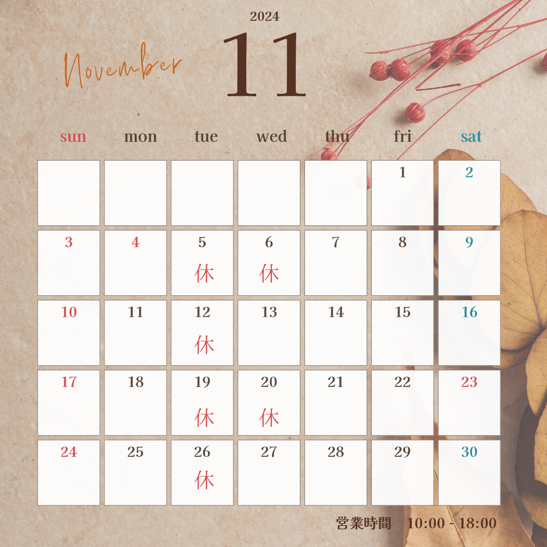 さて、11月の定休日は下記の通りとなりますので、お知らせいたします。
