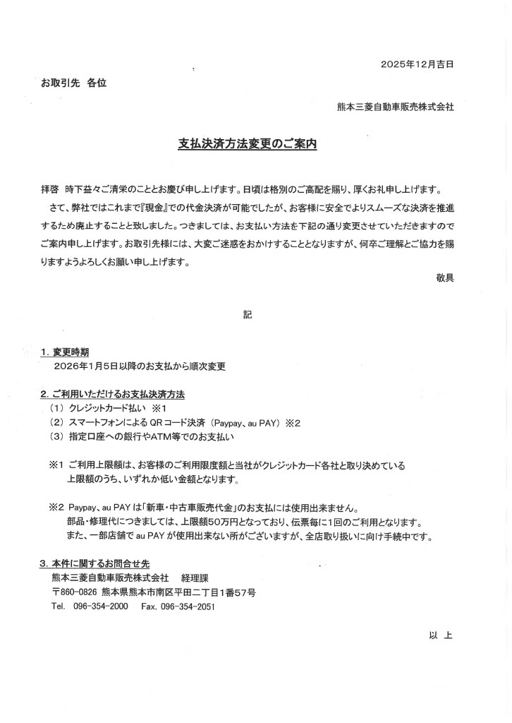 熊本三菱自動車販売株式会社 八代店からのお知らせ