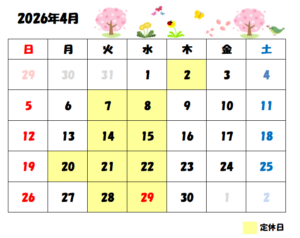 4月定休日のお知らせ