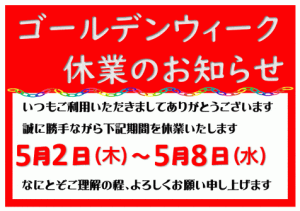 GW中は猛暑等が予報されてますので皆様、お体には十分にお気をつけてお過ごしください![]()