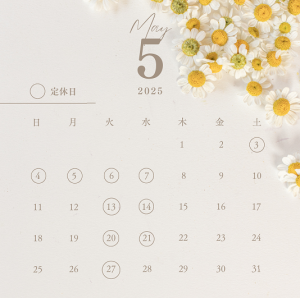 5月の店休日は、毎週火曜日と第1・2・3水曜日にお休みを頂きます。