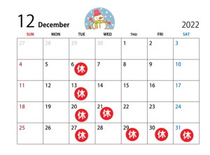 また、12月29日(木)~1月3日(火)まで年末年始のお休みを頂きます。