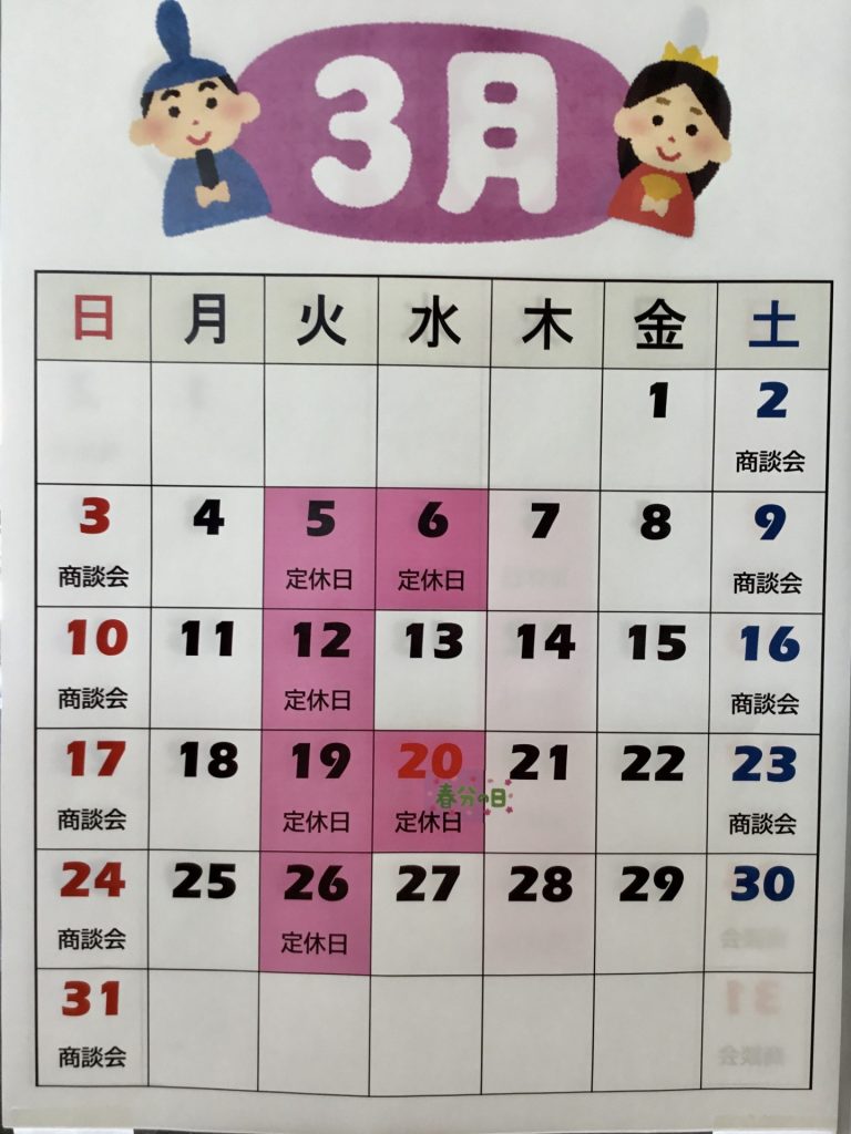 3月の店休日は毎週火曜日と第1・第3水曜日です。
