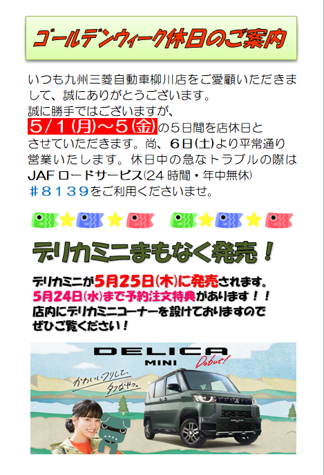 九州三菱自動車販売株式会社 柳川店からのお知らせ