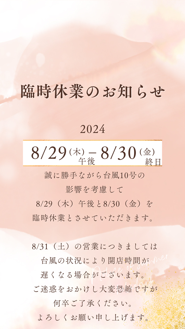 誠に勝手ながら本日8/29(木)午後・8/30(金)終日