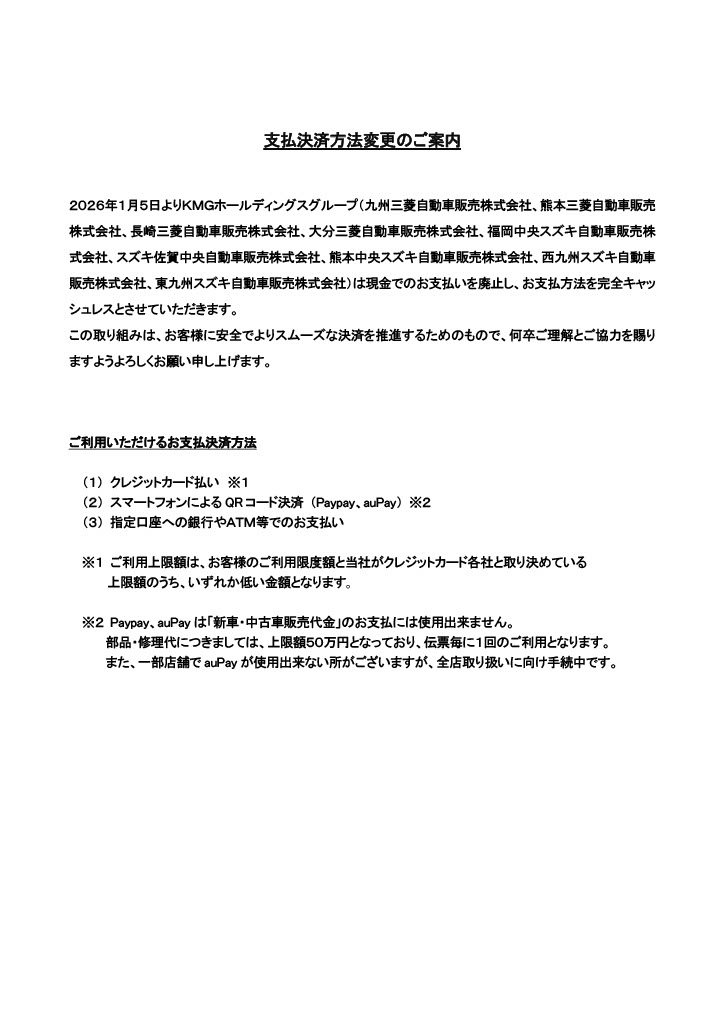 2026年1月5日より現金の取り扱いを廃止し、完全キャッシュレスとさせていただきます。