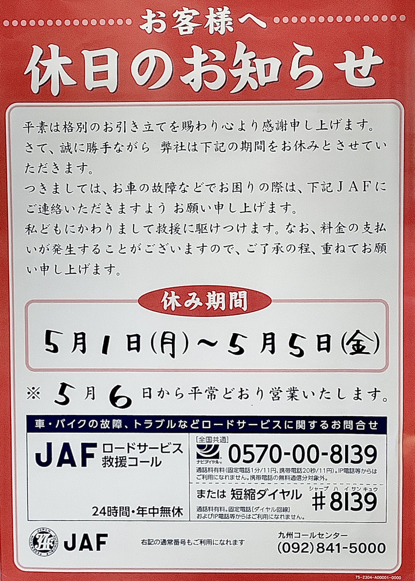 私共、九州三菱自動車鳥栖店も誠に勝手ながら
