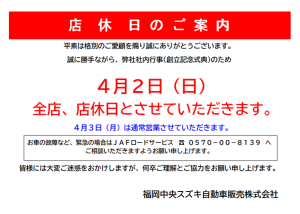 4/2(日)の店休日のお知らせです。