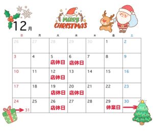 12月は毎週火曜日と第1・3水曜日の店休日加えて