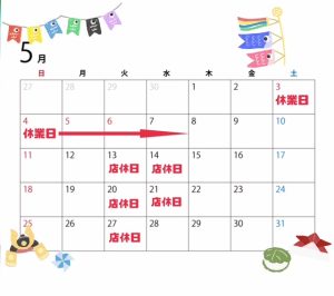 また、5/3(土)~5/7(水)までは休業日とさせていただきます。