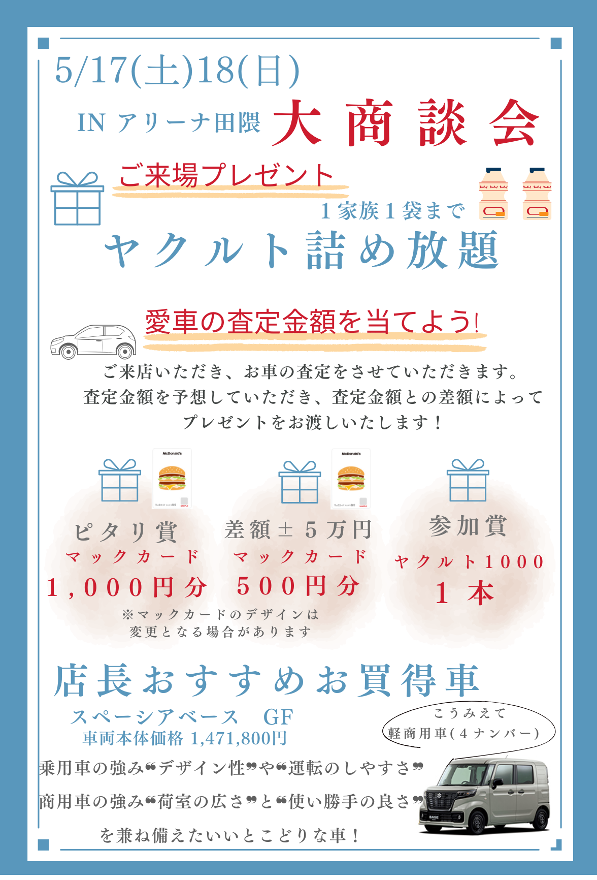 5月17日・18日はワクワク大商談会!みんなで盛り上がりましょう~アリーナ田隈店~