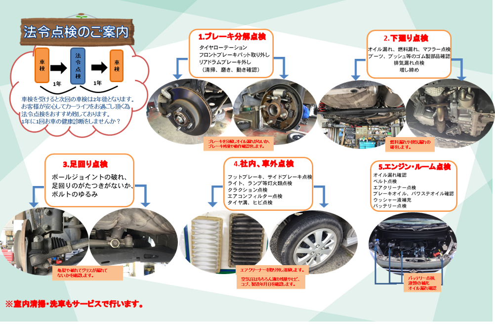 普段使っていて点検できないブレーキパッドや下廻りの点検、タイヤのローテーション等...