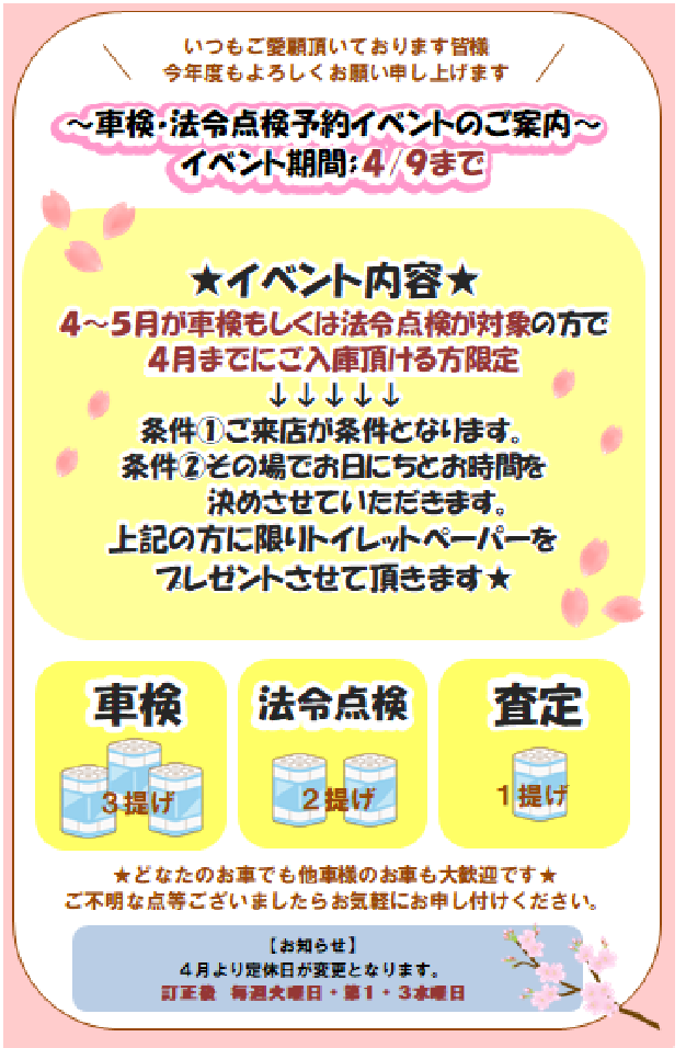 先日ご案内しておりました「車検・点検ご予約・査定キャンペーンイベント