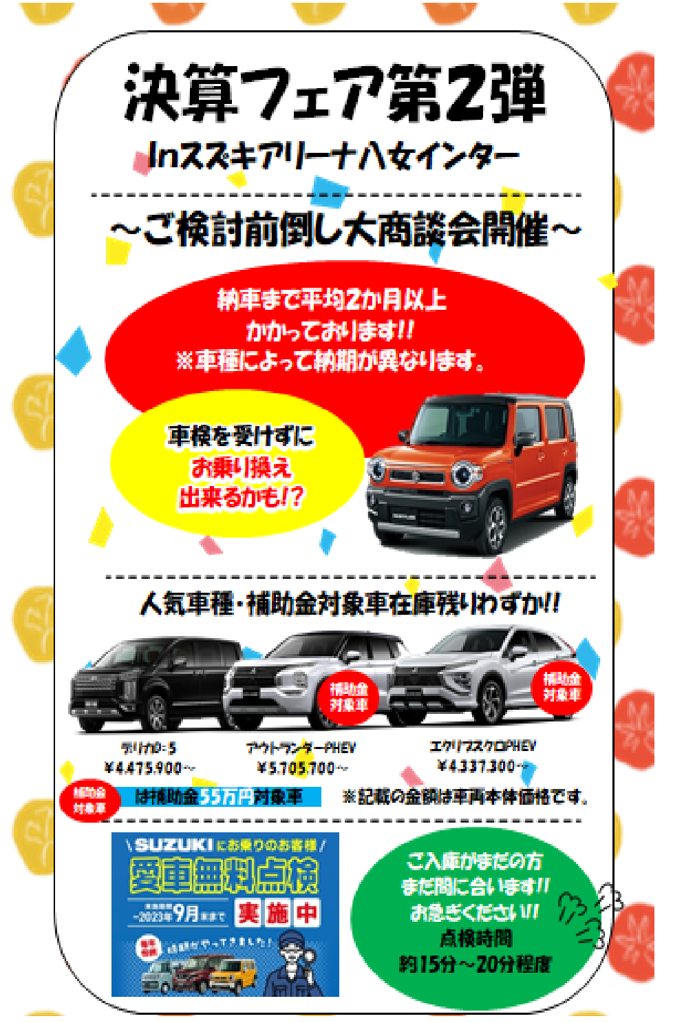 福岡中央スズキ自動車販売(株)アリーナ八女インターからのお知らせ