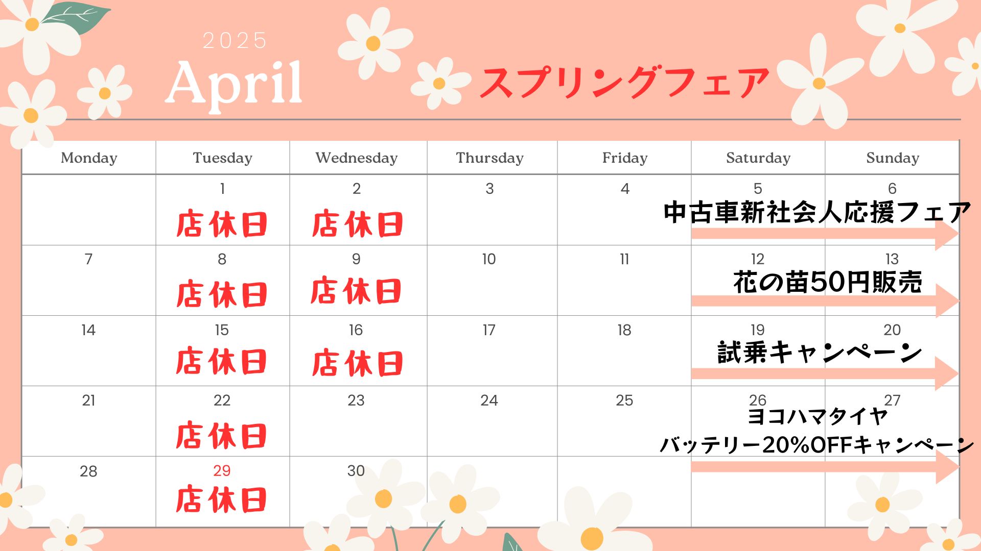 4月のイベントカレンダーです4月は春らしい暖かいイベントが盛りだくさんです