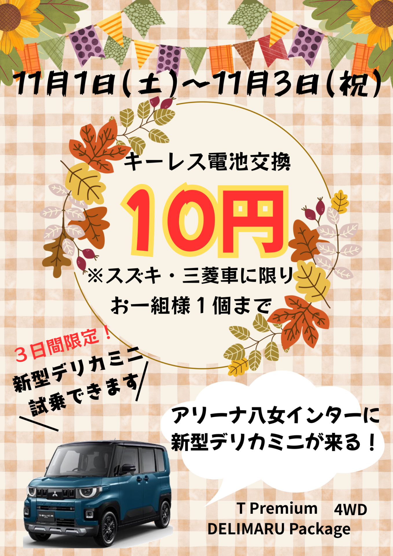 11/1(土)~11/3(祝)の間、新型デリカミニが八女店でご試乗いただけます![]()