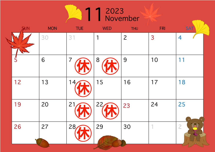 11月の店休日は毎週火曜日と第1・3水曜日です。