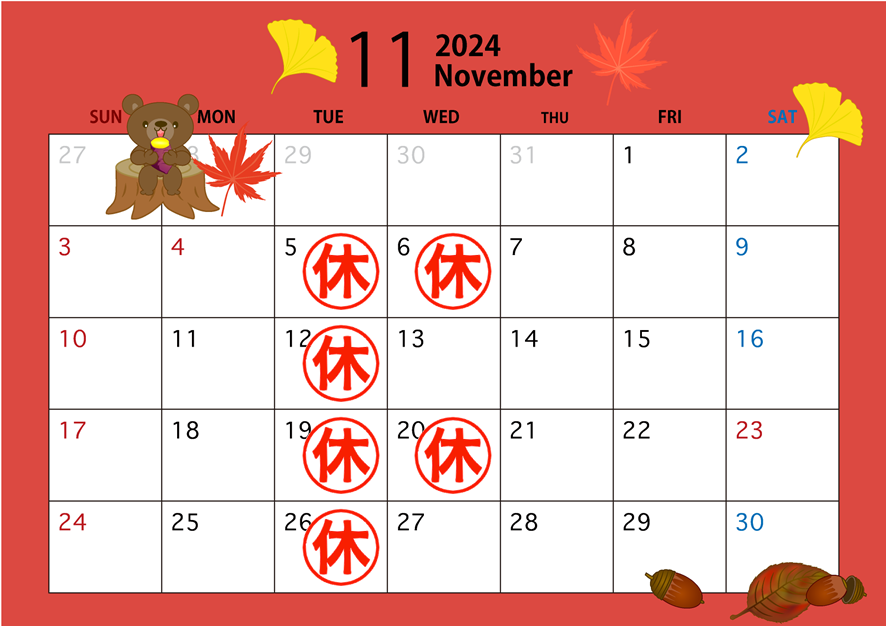 11月の店休日は毎週火曜日と第1・3水曜日です。