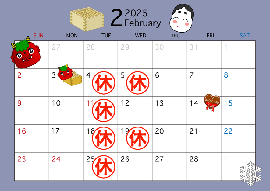 2月の店休日は毎週火曜日と第1・3水曜日です。