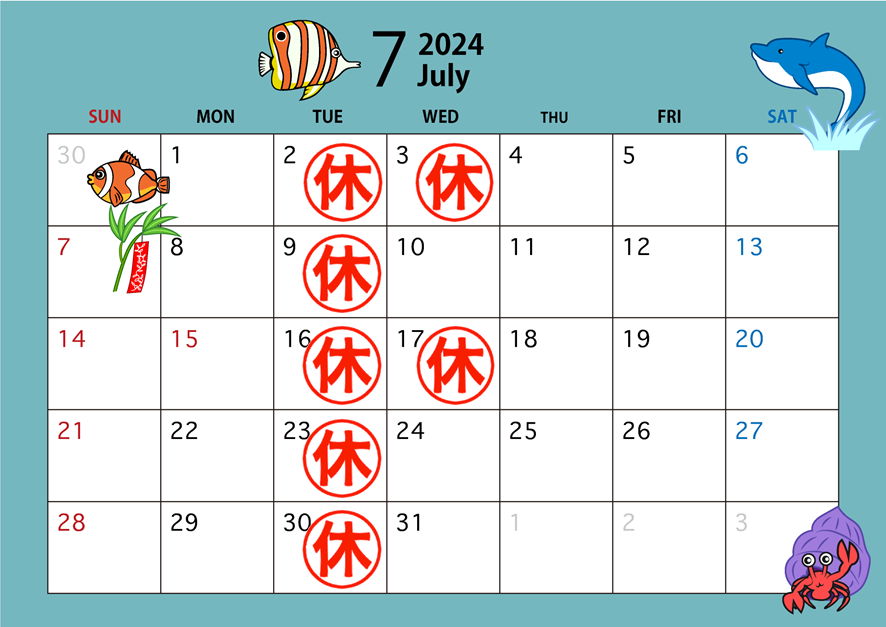 7月の店休日は毎週火曜日と第1・3水曜日です。