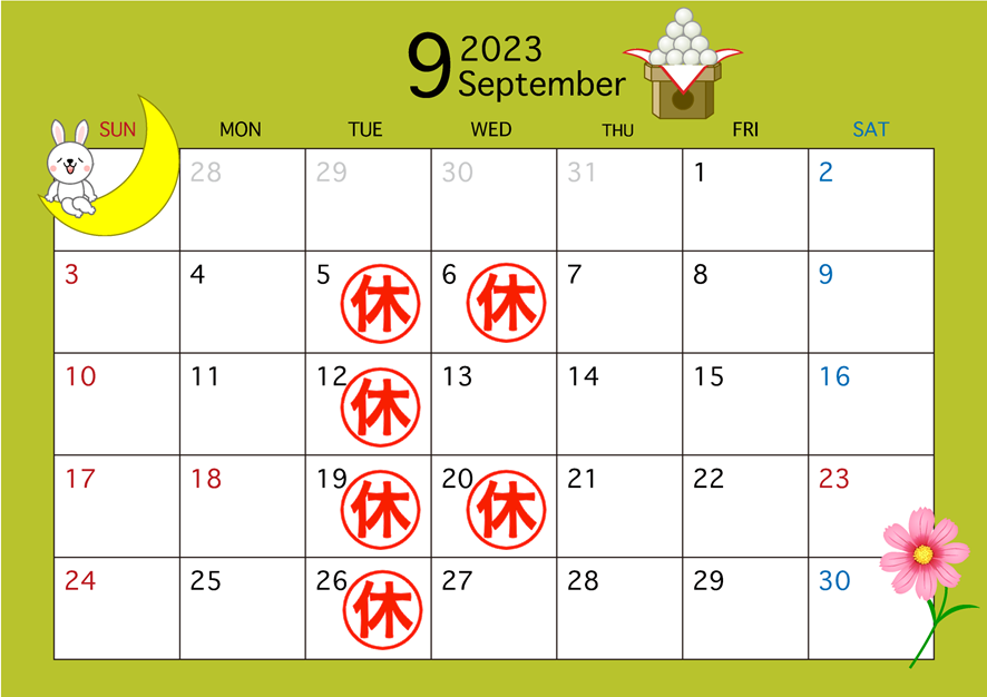 9月の店休日は毎週火曜日と第1・3水曜日です。