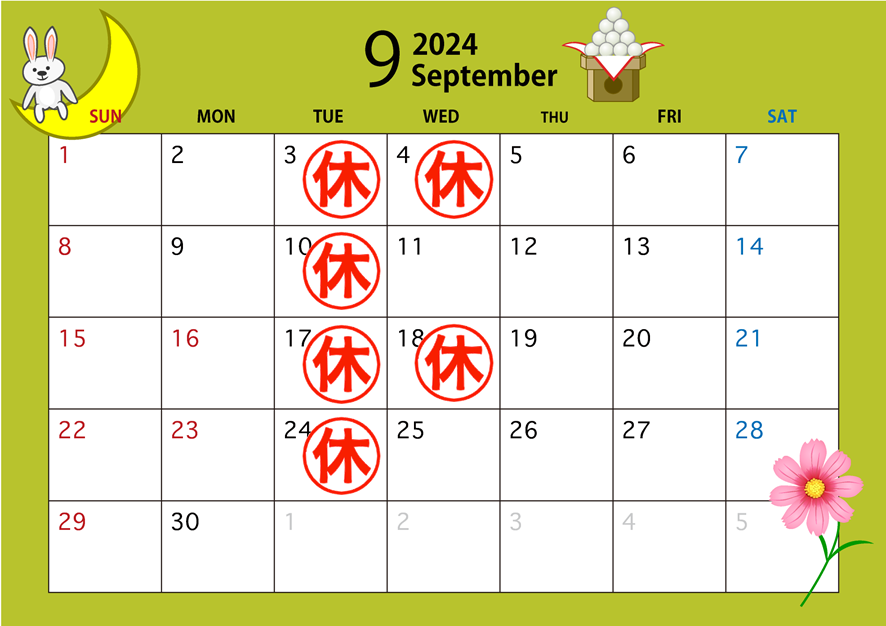 9月の店休日は毎週火曜日と第1・3水曜日です。