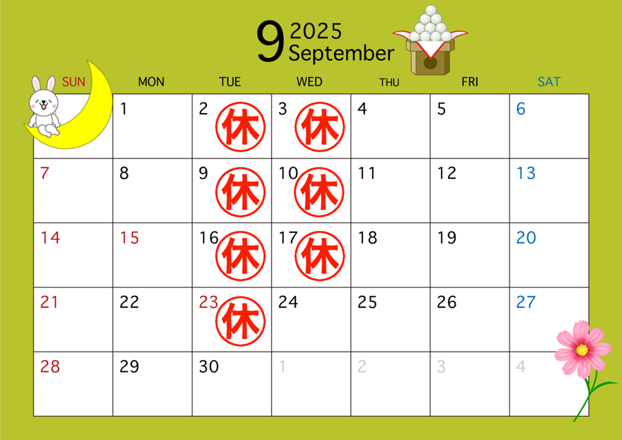 9月の店休日は毎週火曜日と第1・2・3水曜日です。