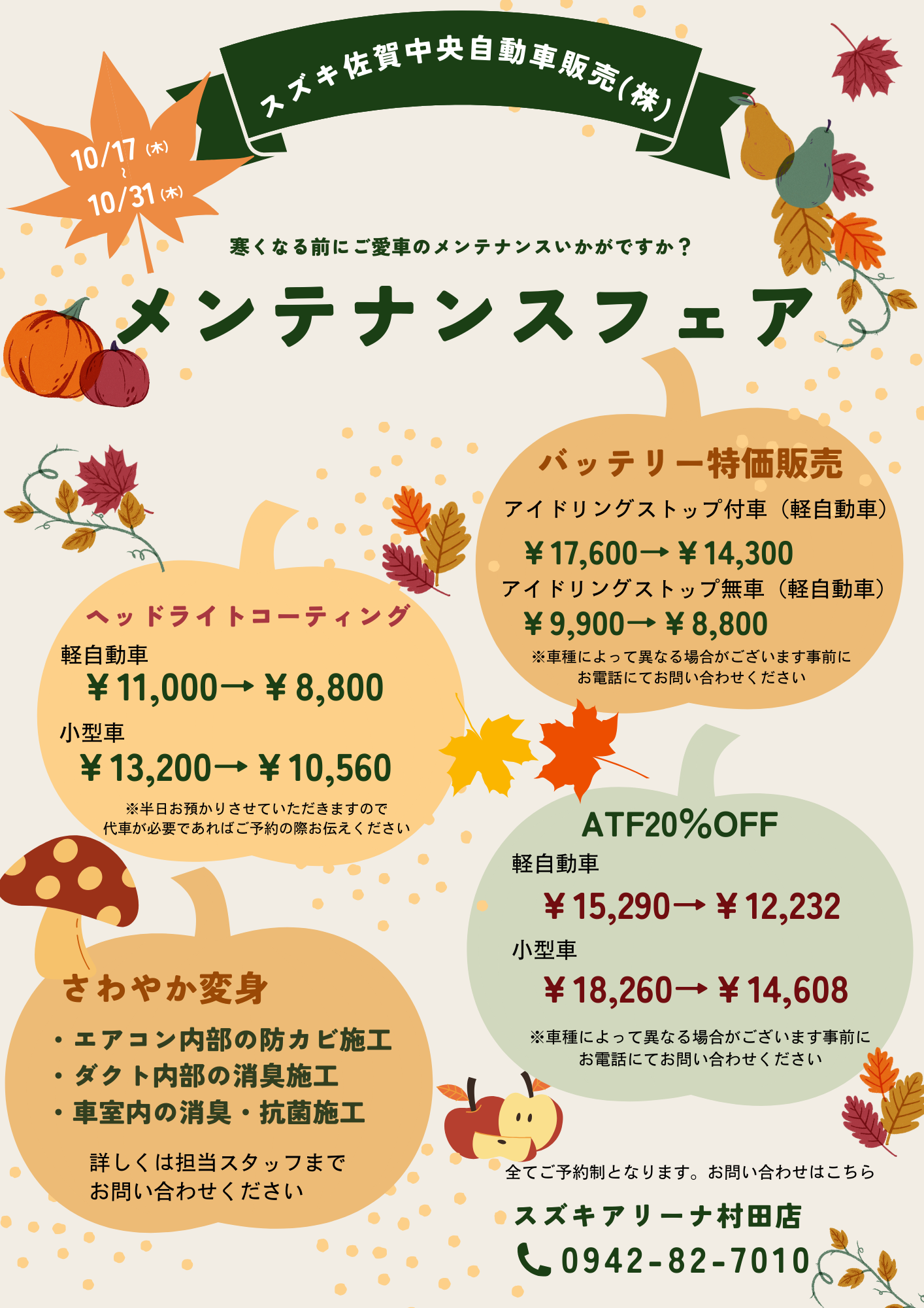 本日10月17日より10月31日までメンテナンスフェアを開催します![]()